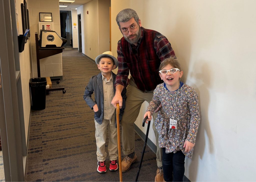 Dr. Moyer, Ava and Finley dressed up for the 100th day of school.